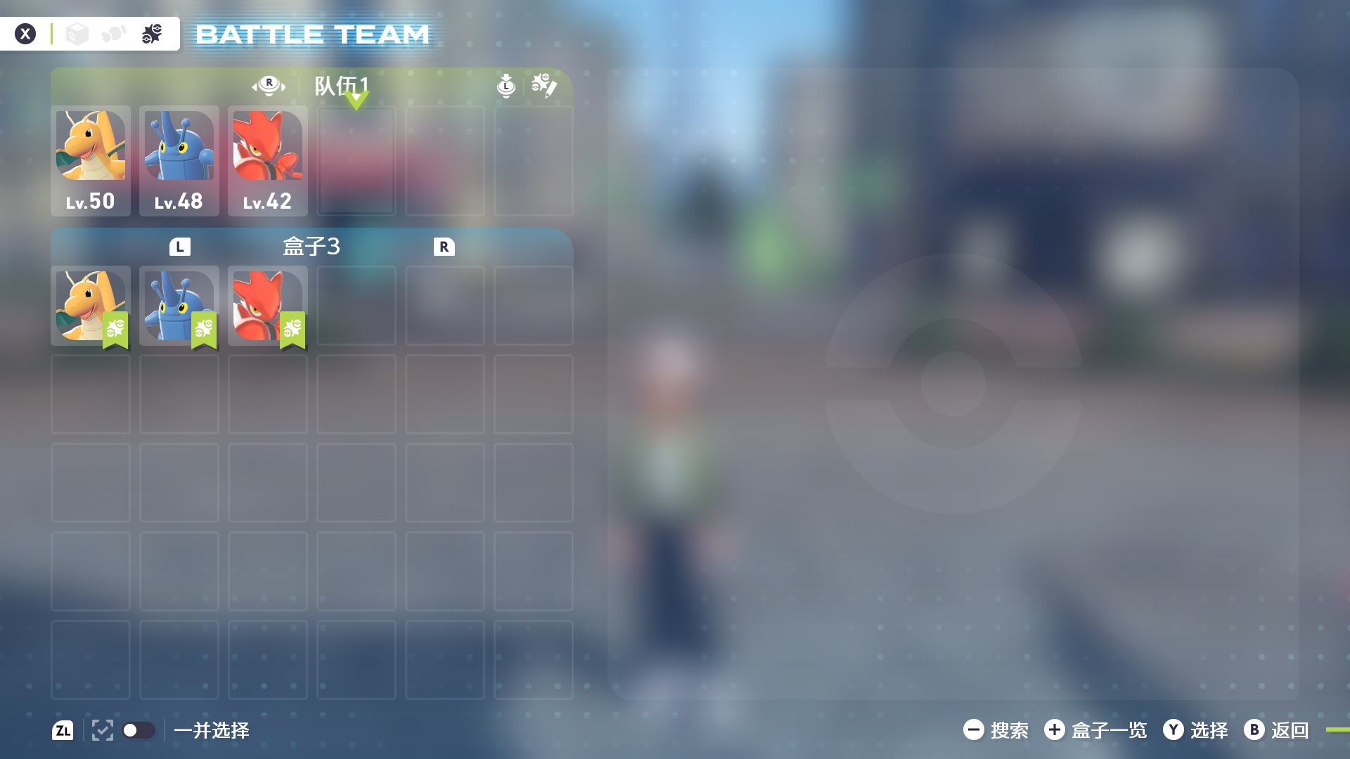 首先是登记对战队伍。在打开主菜单中“盒子”的状态下按下2次X键后,队伍会从“同行”切换至“对战队伍”。从盒子中选择3只要参加级别对战的宝可梦,组成1支队伍吧。由于无法让同行宝可梦加入队伍,因此请事先把要登记的宝可梦放进盒子吧。